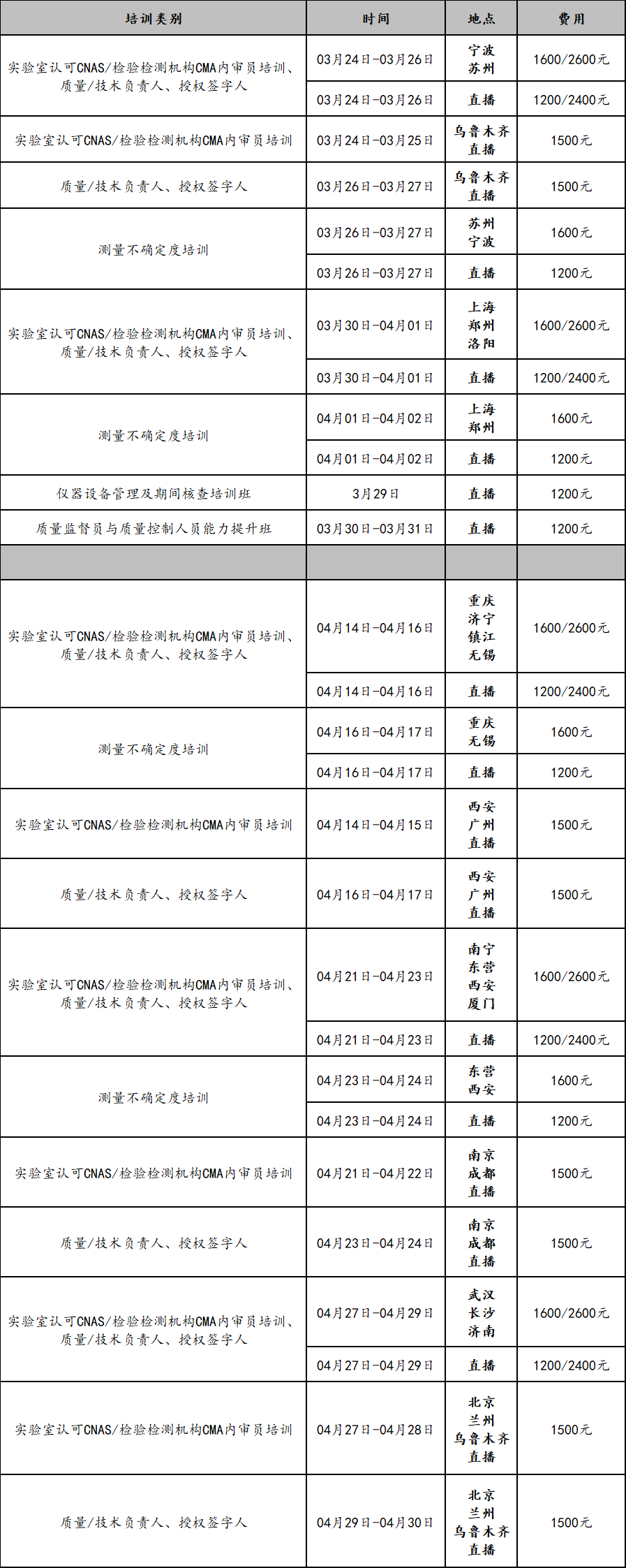 2)参加“质量/技术负责人及授权签字人”培训班(3天课程),培训费:1600元/人,颁发一本培训合格证书。