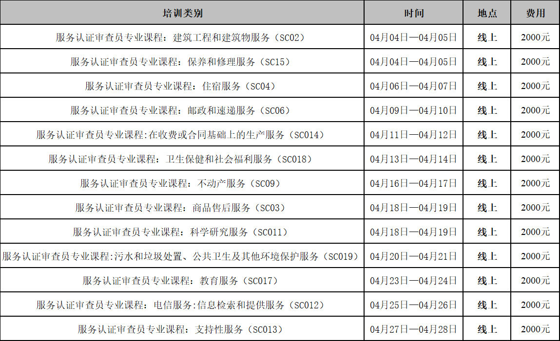 为满足认证人员学习和掌握服务认证的相关知识,满足服务认证审查员的专业能力要求,按照中国认证认可协会(CCAA)《服务认证审查员注册准则》要求。我单位将举办“服务认证审查员专业知识培训课程”,现将培训相关事宜通知如下: